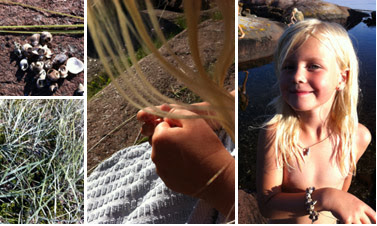 La barna lage sine egne smykker av skjell. Flott aktivitet på stranden. Det eneste man trenger er noen skjell med hull i og ett langt strå av siv som deles til passe tykkelse. Så er det bare å tre skjellen på snoren. Her er det bare fantasien som detter grenser, enkle halssmykker eller flotte armbånd.